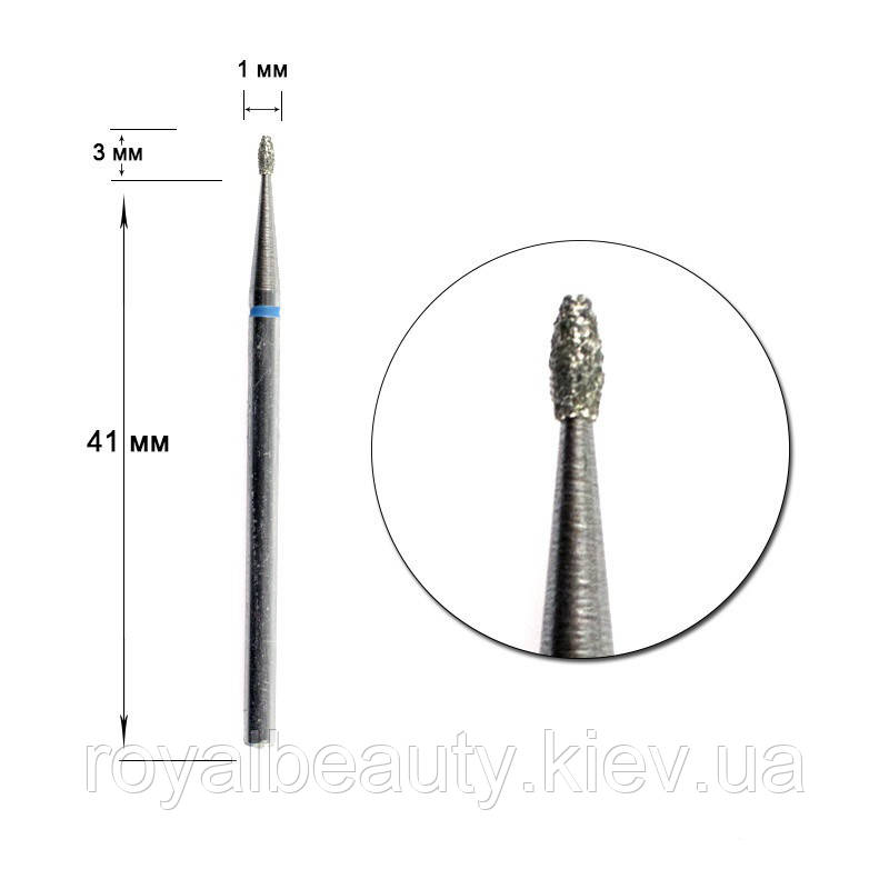 Насадка алмазна форма полум'я заокруглене діаметр 1.2 мм. із синьою насічкою середній абразив використовується для повного оброблення кутикули в манікюрі та педикюрі.
